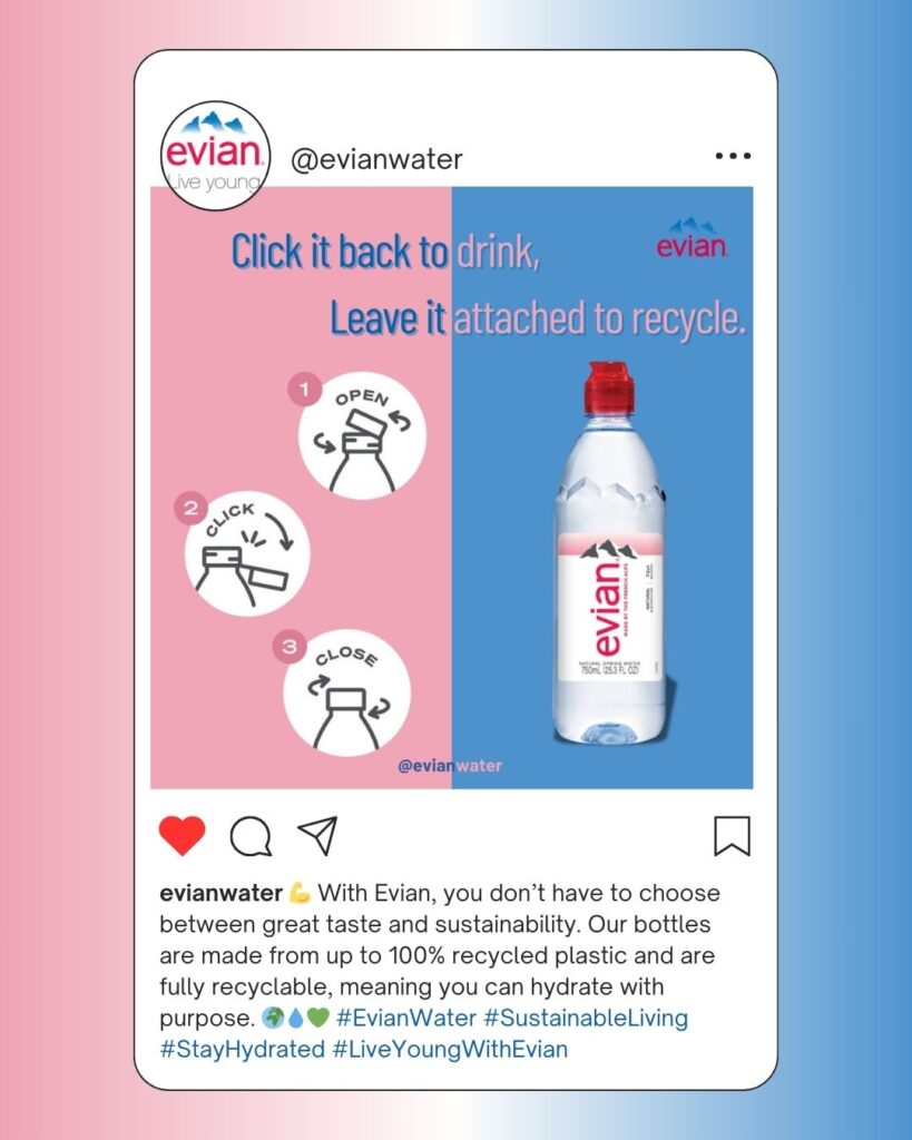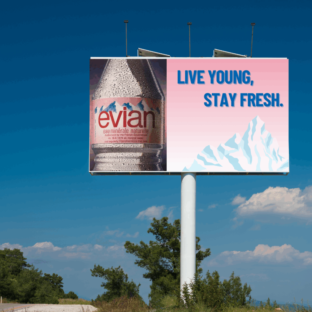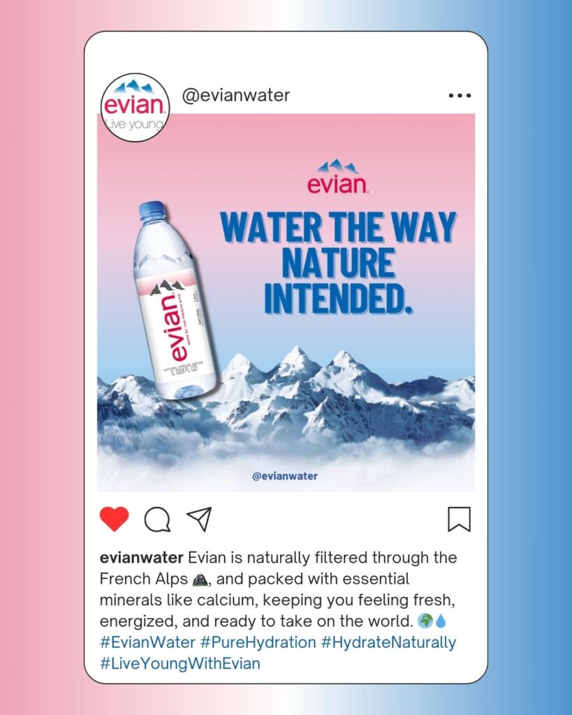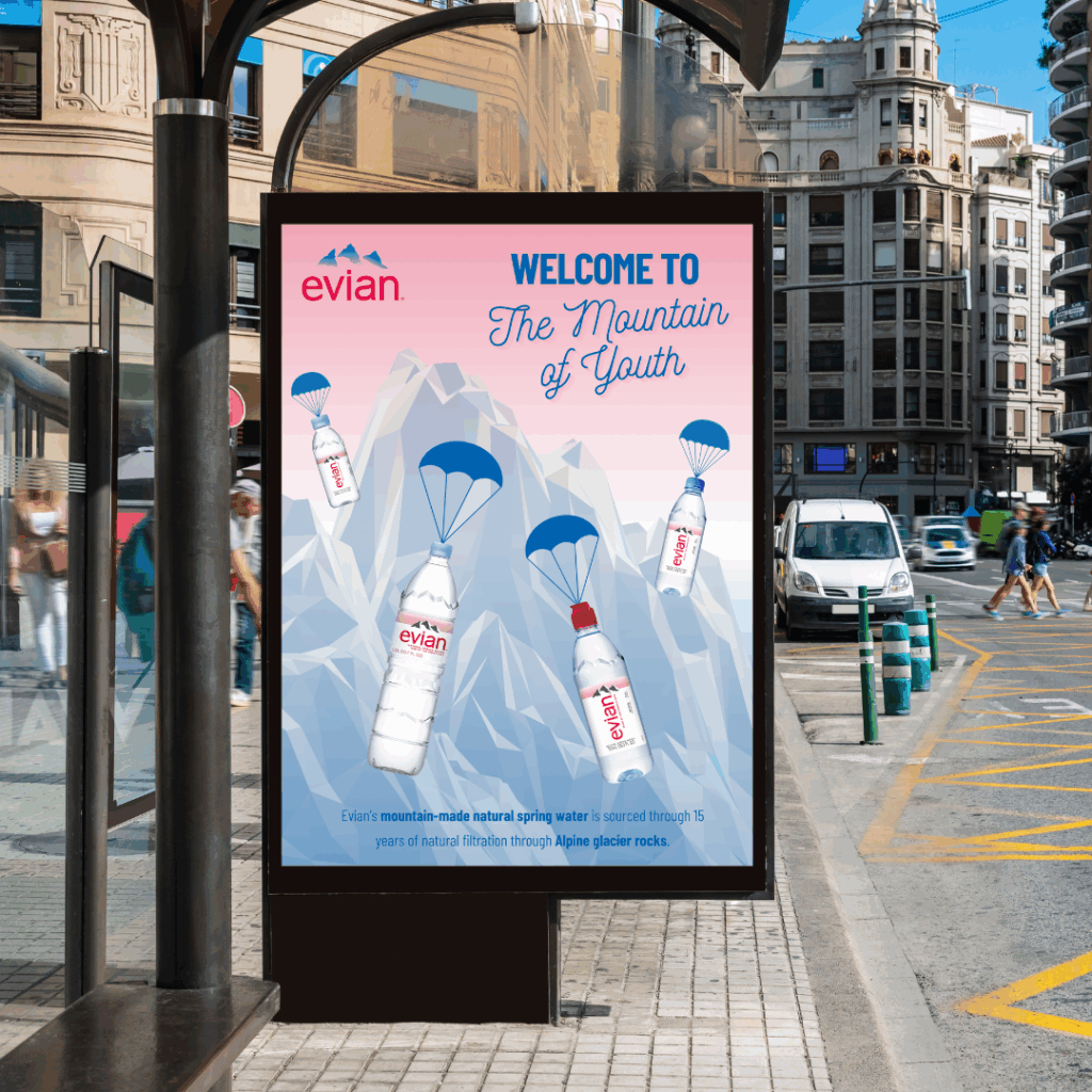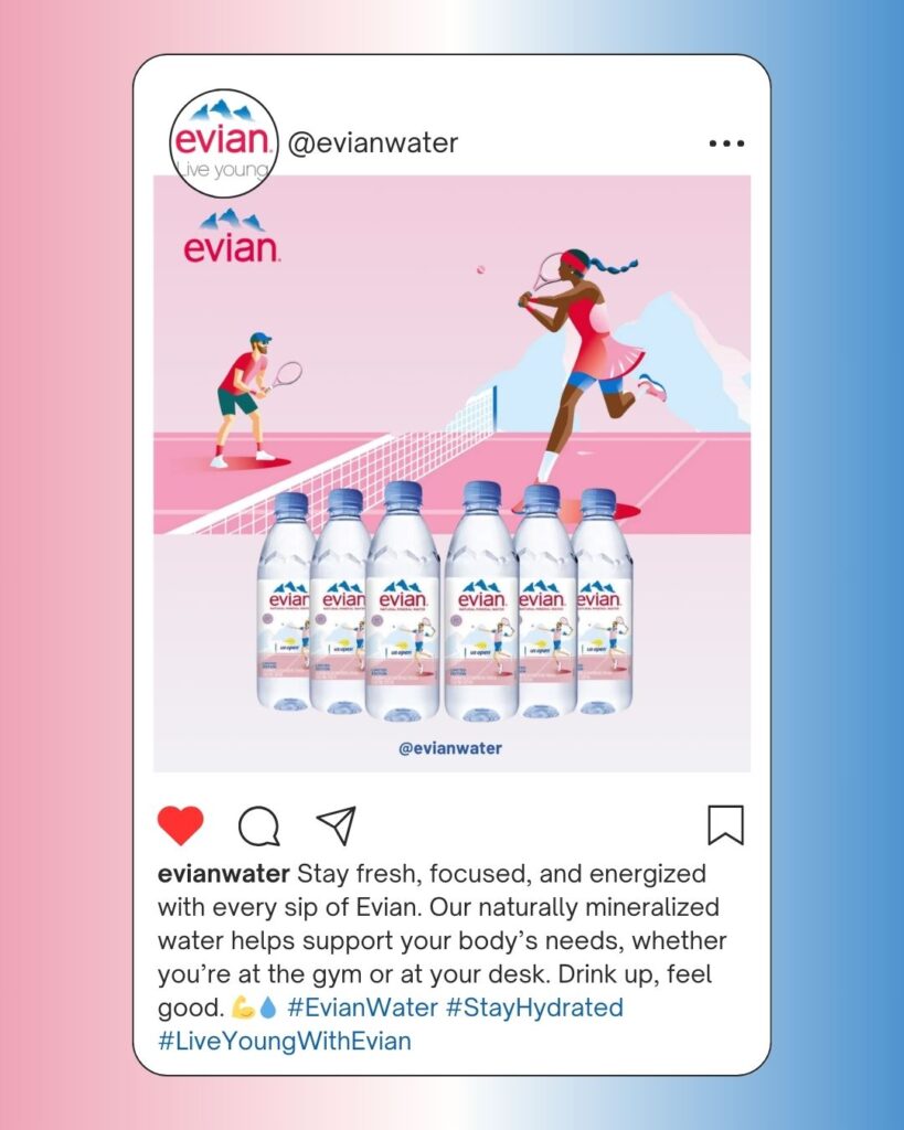 In 2025, Evian launched the Live Young, Stay Fresh campaign to reintroduce the brand as the ultimate hydration companion for health-conscious, on-the-go individuals. Inspired by the growing demand for wellness, beauty, and sustainable living, Evian created a lifestyle-driven campaign that highlights the importance of daily hydration. With a focus on clean, natural water sourced from the French Alps and a commitment to eco-friendly practices, Evian blends beauty, fitness, and sustainability to connect with a new generation of mindful consumers.